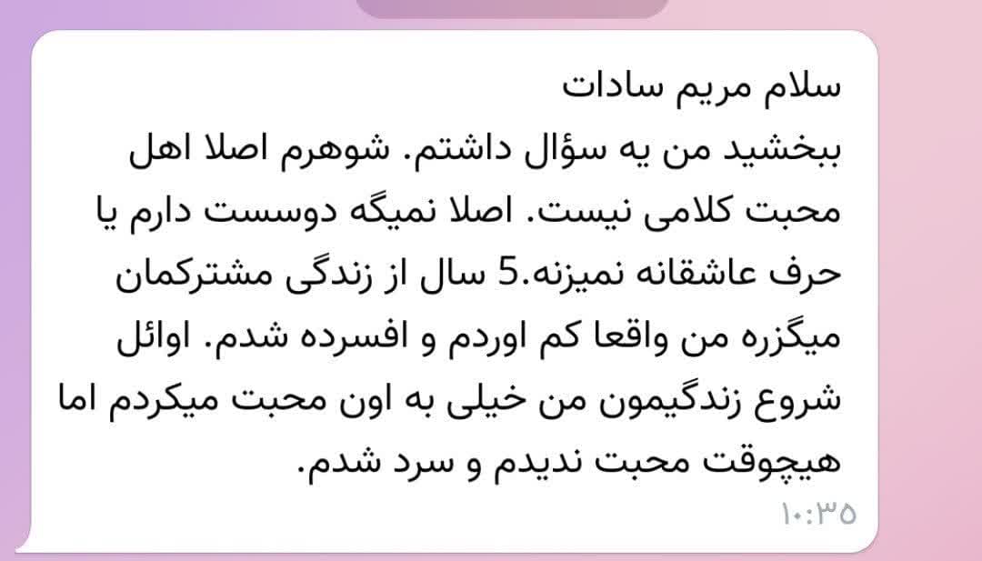 سوال:با شوهر سرد.شوهر بی محبت چه کنم؟ جواب: ♦️بیا بگم چجوری. مردها چند دسته هستند، یک عده برون گران،و خودکار بدون هیچ نیروی محرکه ای بهتون محبت کلامی خواهند داشت. عده ای درونگرا هستند،محبت کلامی ندارند. برای دسته دوم باید وقت گذاشت و صبوری کرد. چطوری؟ حالا ممکنه بپرسی چجوری میشه من صبح تا شب قربون صدقه اش برم و به شوهرم اقتدار بدم که تو چقدر مردی چقدر آقایی، تاج سری بعد هیچی هم از جانب اون نشنوم؟؟ ♦️جواب: گذشته ها گذشت،به قول امام هادی افسوس گذشته رو با تلاش در آینده جبران کن. از همین لحظه همین حالا تصمیم بگیر برای رشد درون خودت برای شبیه شدن به الله به همسرت عشق ورزی کنی. با صبوریت کمک کن به جهان،بذار تا ابد فرکانس صدای دوست دارم هایِ همسرت نه فقط شما رو جهان رو نوازش کنه ♥️ ♦️خودت محبت رو از همسرت بکش و به خودت تزریق کن.مثلا میری کنار همسرت بهش میگی دوسم داری؟ منتظر نشو بگه معلومه عشقم تو جان منی تو همه زندگیمی، نفسمی. شما فعلا به همون بله قناعت کن.من بهت قول میدم با صبوری، با اقتدار دهی اون بله به حرفهای زیباتری تبدیل میشه. *اگر پیامکی بیشتر ابراز علاقه میکنه از روش پیامکی استفاده کن. ♦️دوست داری نوازش بشی؟ برو کنارش بشین دسش رو بگیر بذار لای موهات، دستش رو بگیر بذار روی صورتت و با دستِ ایشون خودت رو نوازش کن. ♦️به هیچ وجه بهش نگو چرا بهم نمیگی دوست دارم، چرا بهم نمیگی عزیزم؟ چرا محبت کلامی نداری؟... ♦️اصلا حرفِ آقایون دیگه رو تو خونه نزن، مثلا نگو شوهر فلانی براش اینجور کرد یا اینجوری گفت!اشتباهی که خیلی از زن ها میکنند متاسفانه!! شما فقط به همسر خودت اقتدار باید بدی نه به شوهر مردم!!... ♦️اگر در راستای عشق ورزی، حرکتی انجام داد. اون حرکت رو قاب بگیر و محکم بزن به دیوار دلت و از دیدنش لذت ببر.یوقت بهش نگی کاش از اول زندگی اینجور بودی. کاش از اول زندگی از این حرفها میزدی.چون با گفتن این حرفها شوهرت دنده عقب میگیره.🙂 برچسبها: پرسش و پاسخ [ پنجشنبه هجدهم اسفند ۱۴۰۱ ] [ 1:55 ] [ از نسل او ]